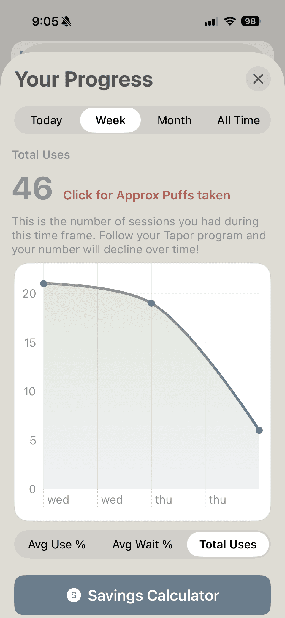 Tapor uses advanced timer algorithms to help you pace your use and work towards a customized goal. You can set limits, cut down or gradually quit when you are ready